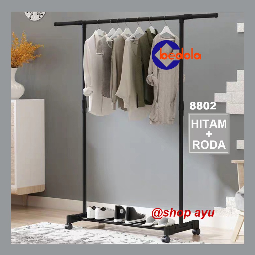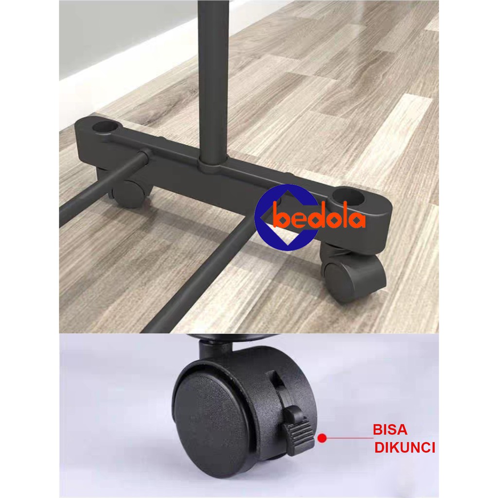 Stand hanger single hitam rak gantungan baju serbaguna dengan 4 roda