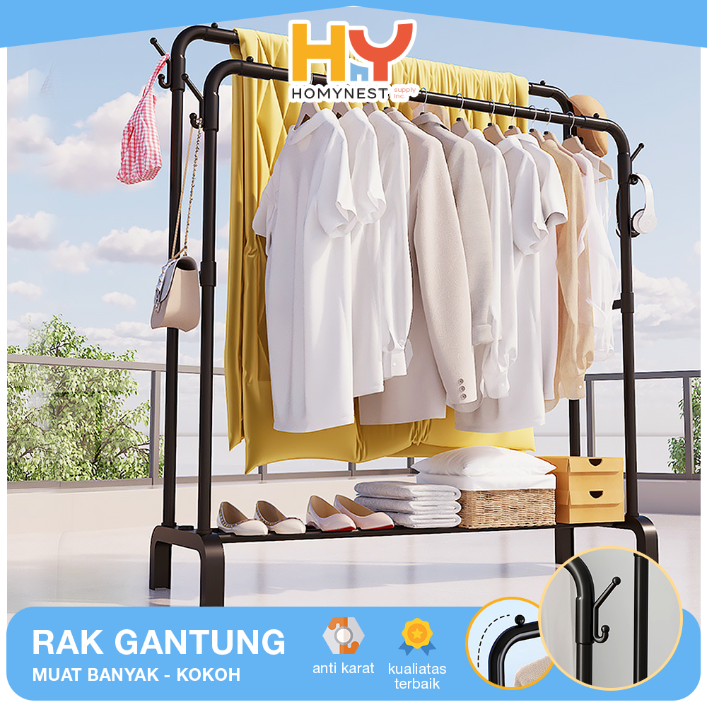 HOMYNEST Stand Hanger Rak Gantungan Baju Serbaguna Bahan Besi Single Double Layer Gawang Baju Premium Berkualitas