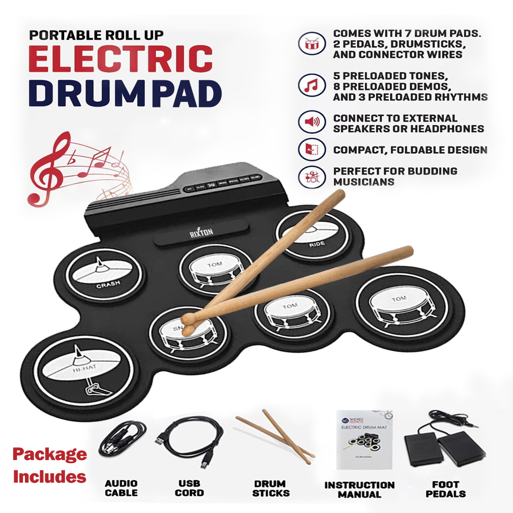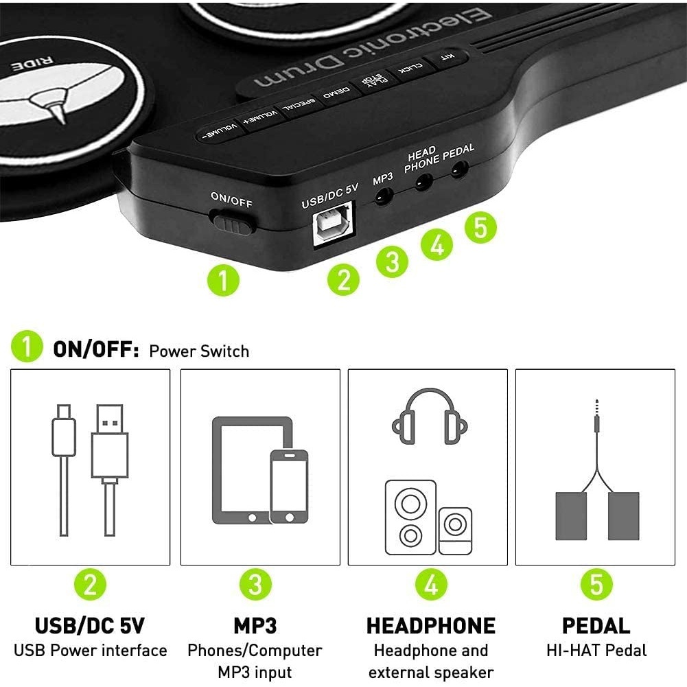 Rixton Drum Elektronik Portabel Digital USB 7 Bantalan Roll up Drum Set Silicone Electric Drum Pad Kit