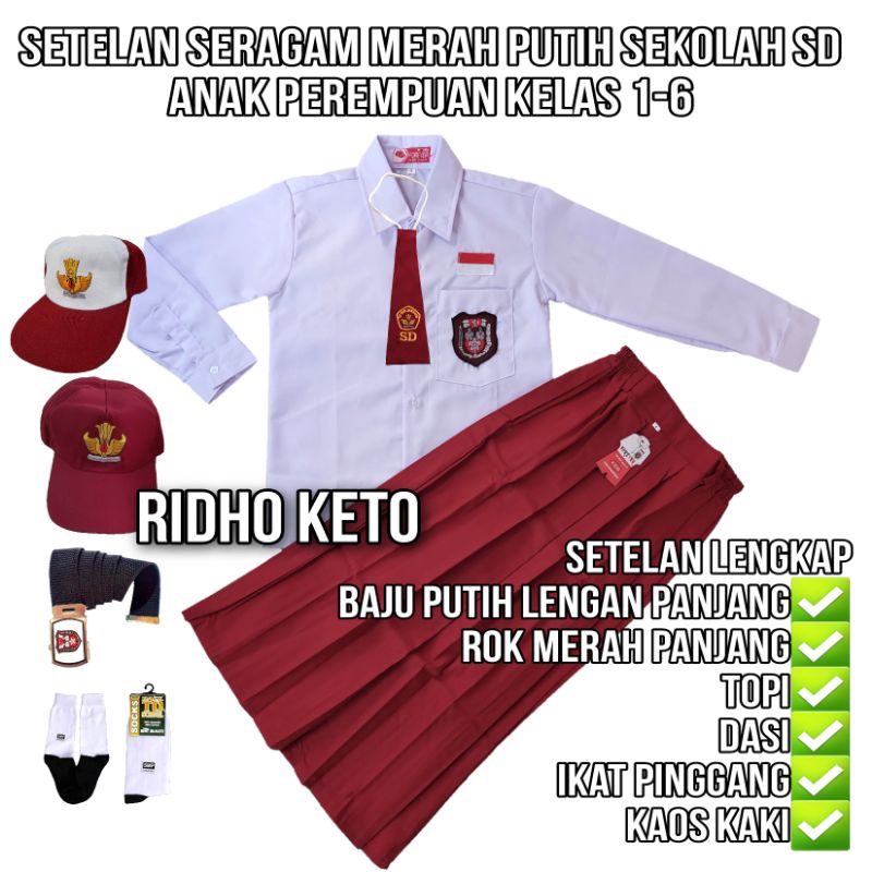 setelan seragam merah putih sekolah SD anak perempuan baju lengan panjang rok merah panjang lengkap