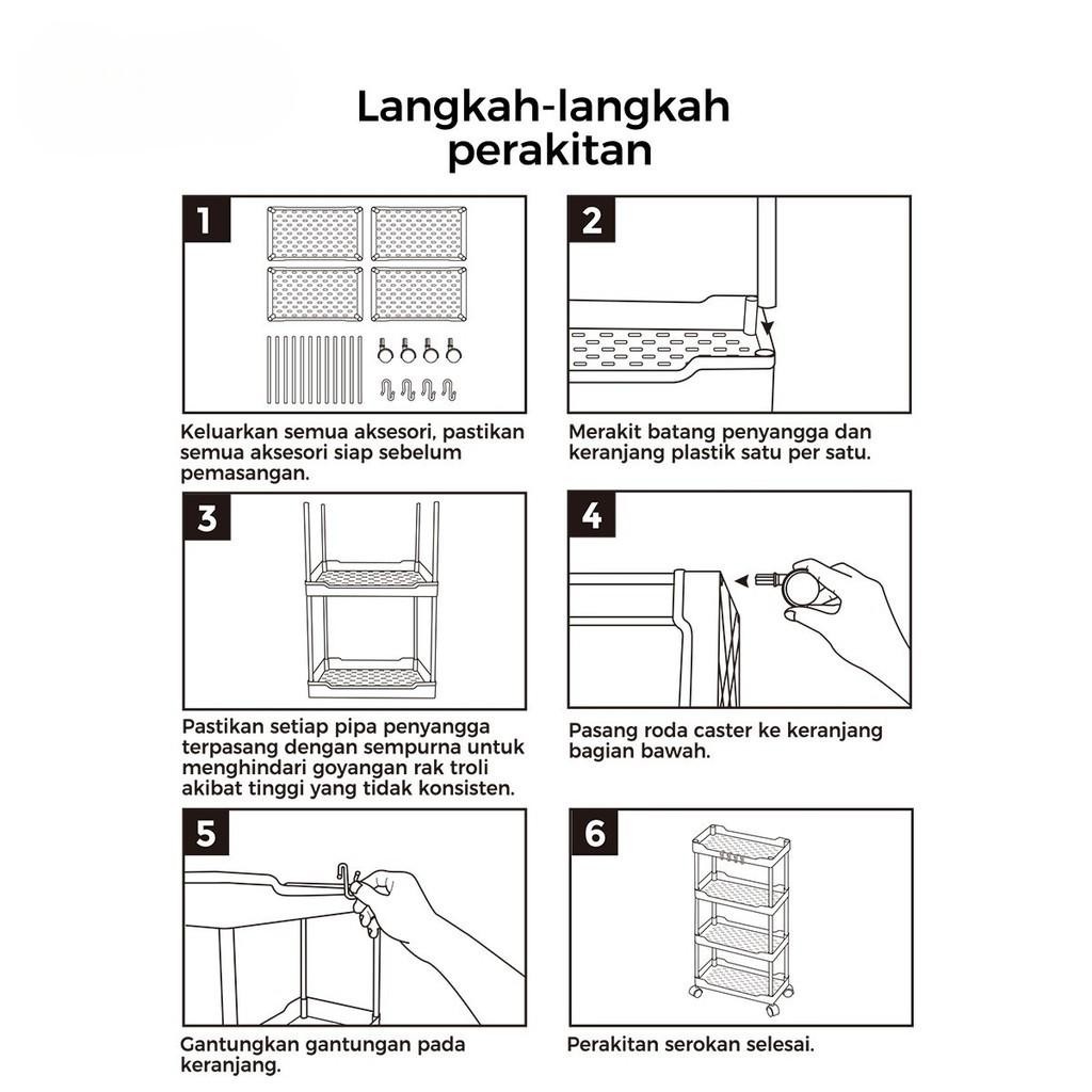 Rak Troli Susun Serbaguna 4 Tingkat dengan Roda dan Pegangan - Warna Hitam/Putih - Rack Rak Troli Serbaguna Plastik 4 Susun Dengan Roda dan Pegangan