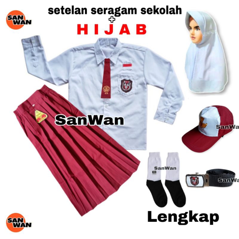 Setelan Seragam Sekolah SD Perempuan Merah Putih Plus Hijab Baju Rok Panjang