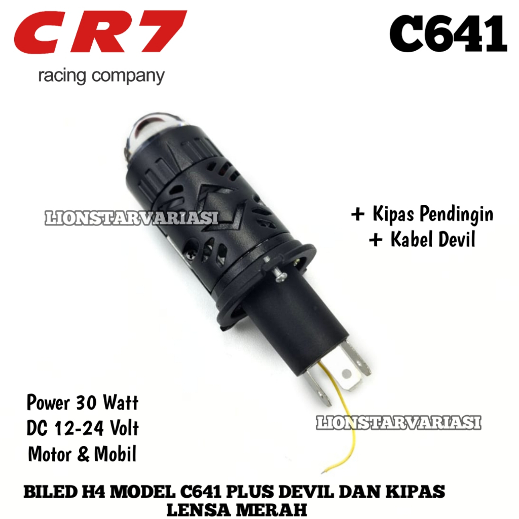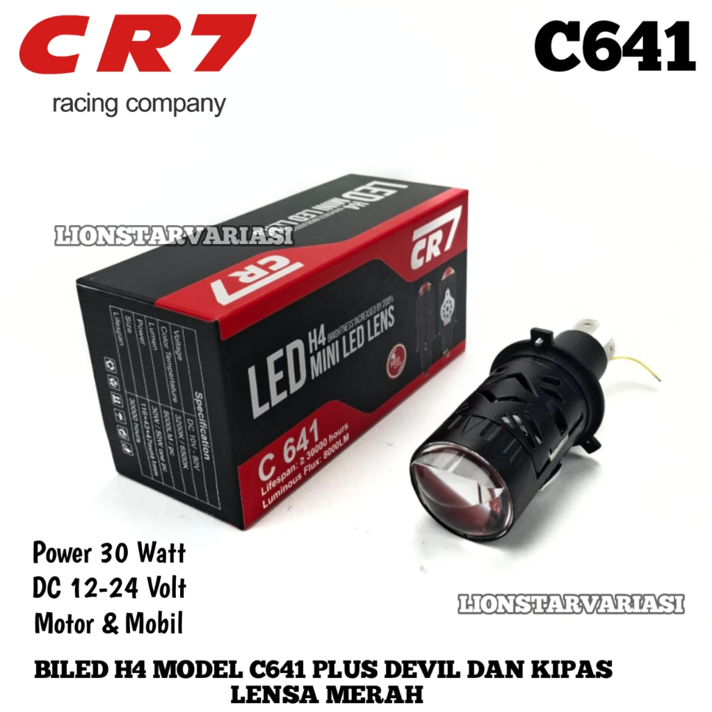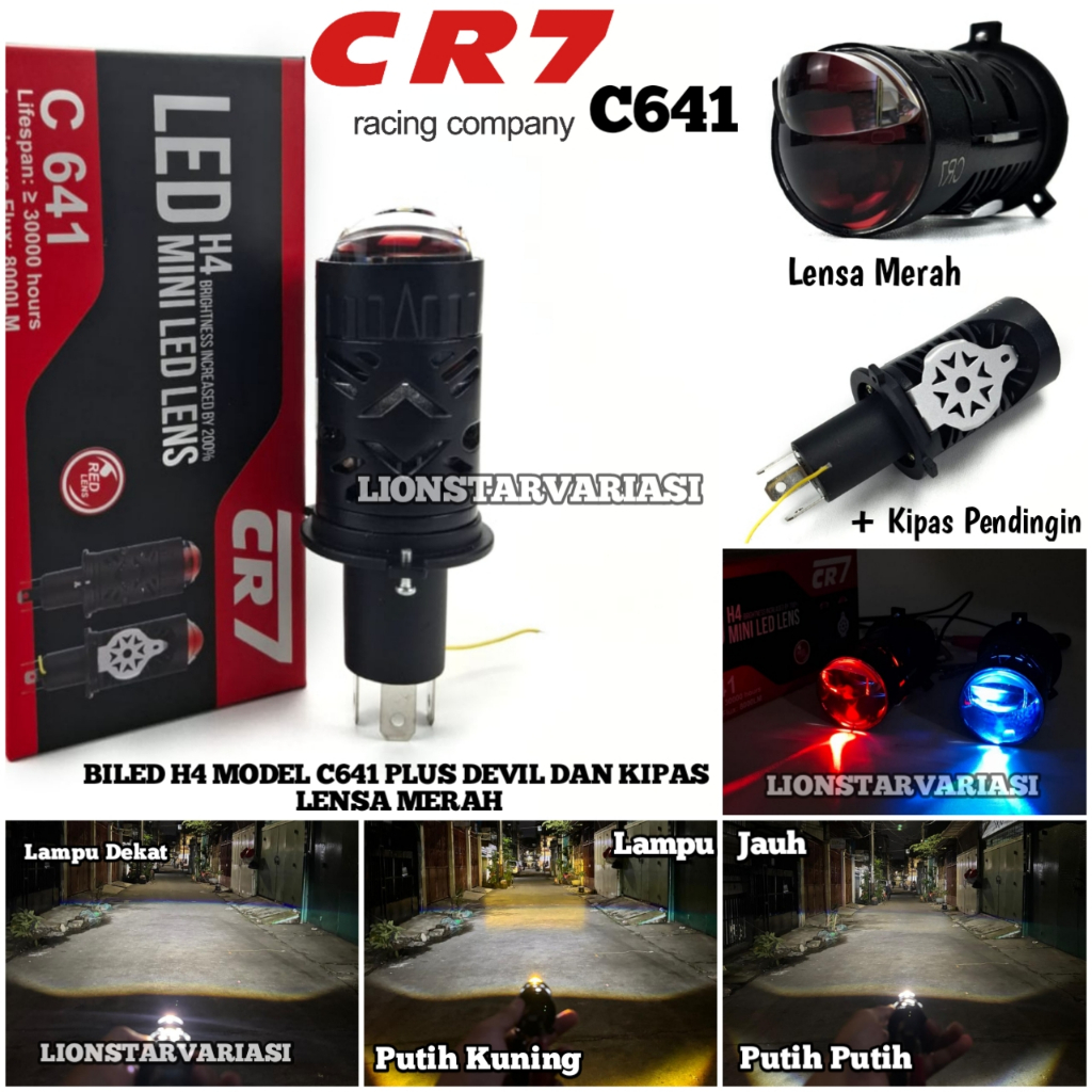 CR7 C641 - Lampu Utama LED H4 Biled Projector Lensa Merah/Red Lens Plus Devil dan Kipas Motor Mobil
