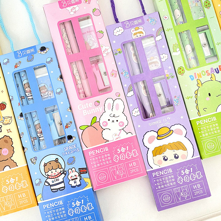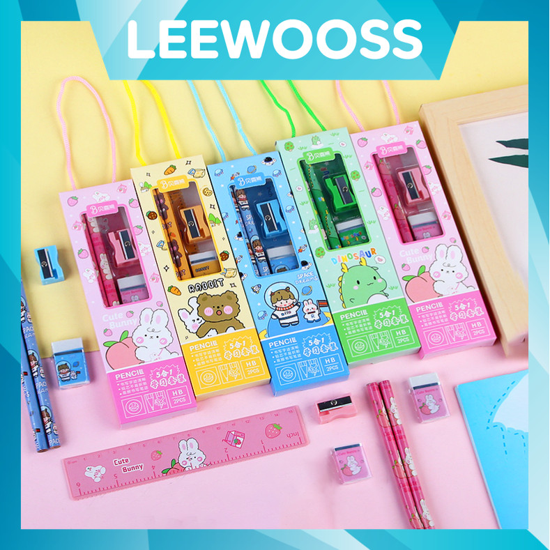 LEEWOOSS S5989 Set Alat Tulis 5 in 1 Set Alat Tulis Kartun Set Alat Tulis 5 in 1 Lucu Set Alat Tulis Anak Motif Kartun