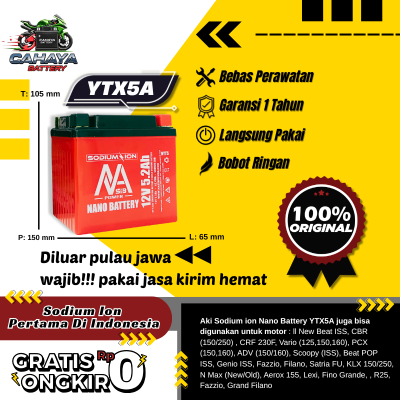 NANO BATTERY Aki Motor Sodium Ion 12.4V 5.2Ah Aki Motor YTX5A Pengganti GTZ6V/YTZ6V/GTZ7S Aki Motor Kering Vario 125 150 160 PCX ADV NMAX