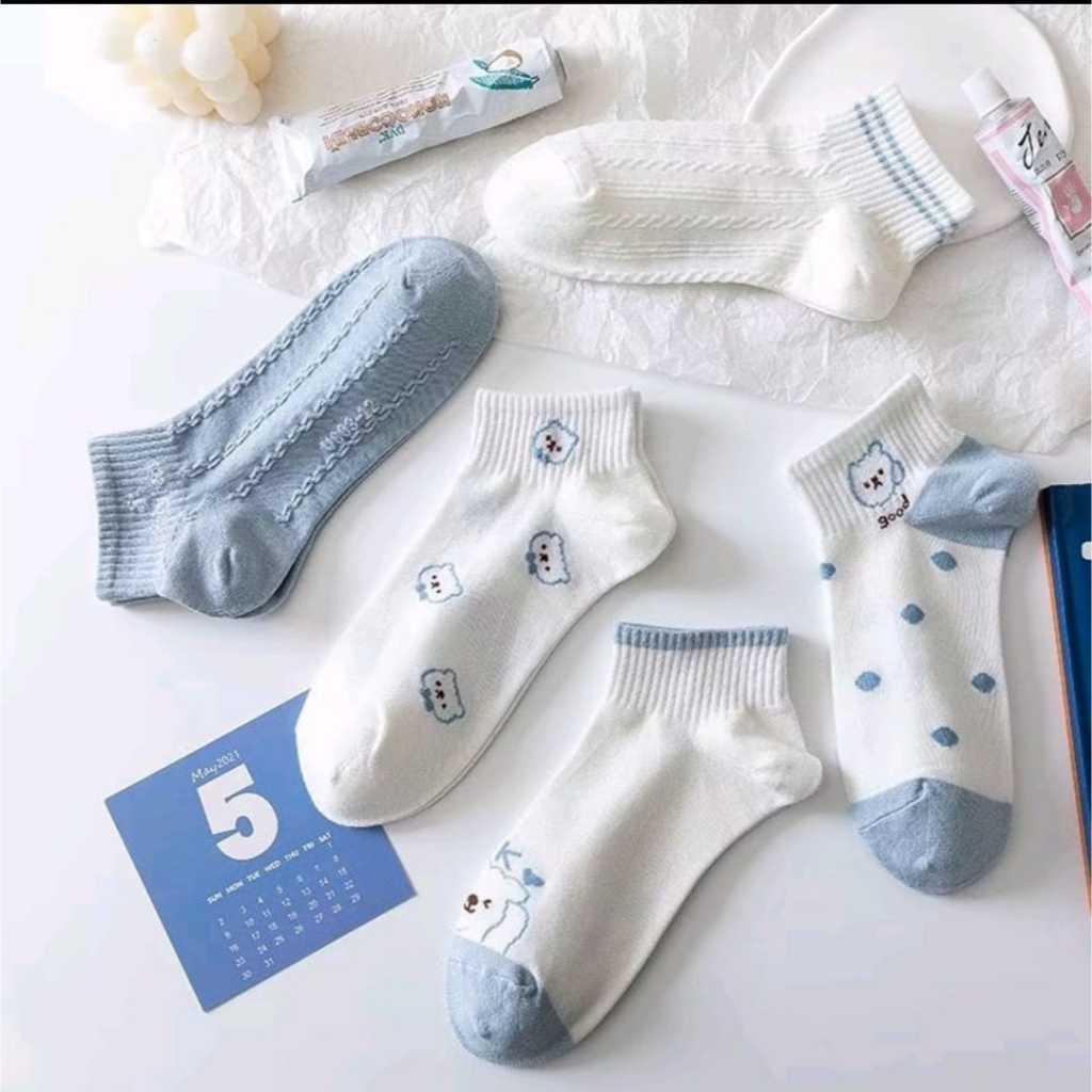 5Pasang Kaos Kaki Pendek Wanita Fashion Ala Korea / Kaos Kaki Pendek Motif Bear Biru