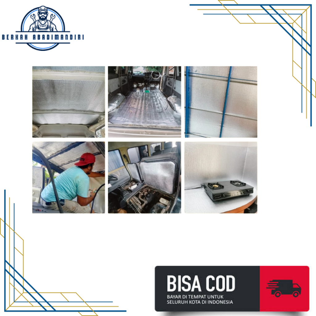 peredam suara dan panas Aluminium foil Tebal: 3 mm Aliminium: 1 sisi Lem : 1 sisi Bagian tengah : XPE foam (sejenis busa) Panjang : 1
