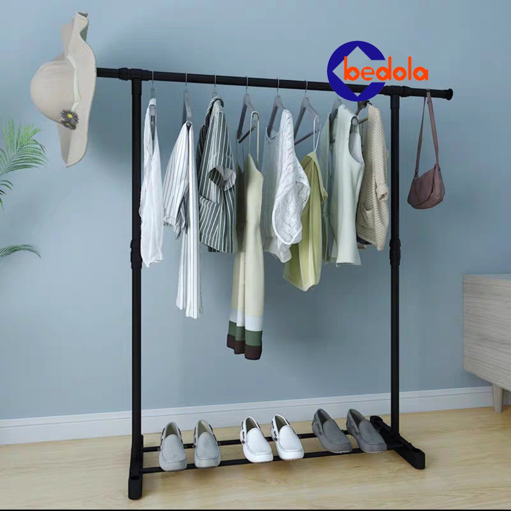 Stand hanger single hitam rak gantungan baju serbaguna dengan 4 roda