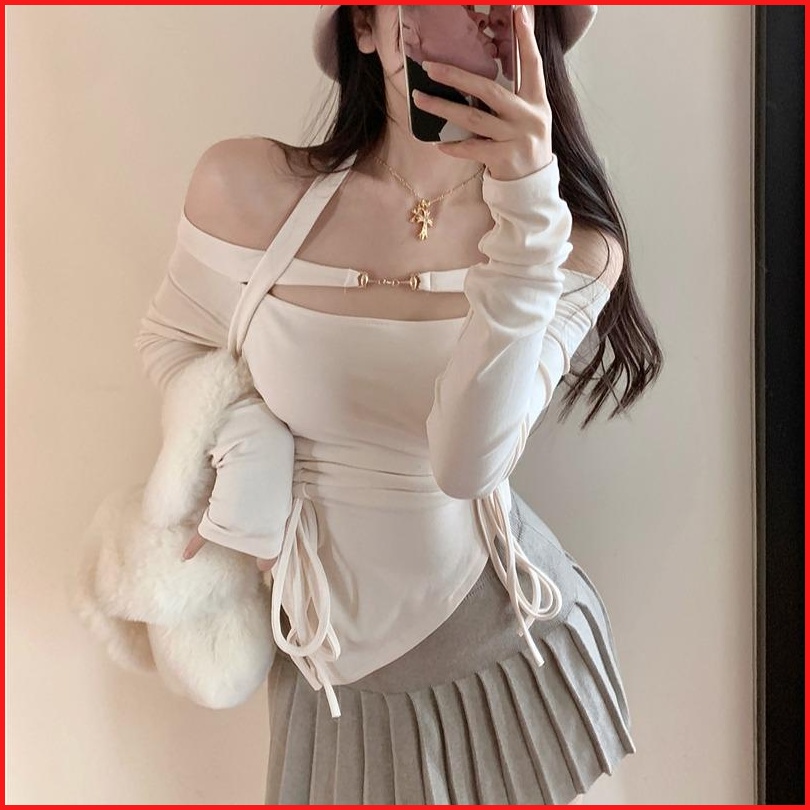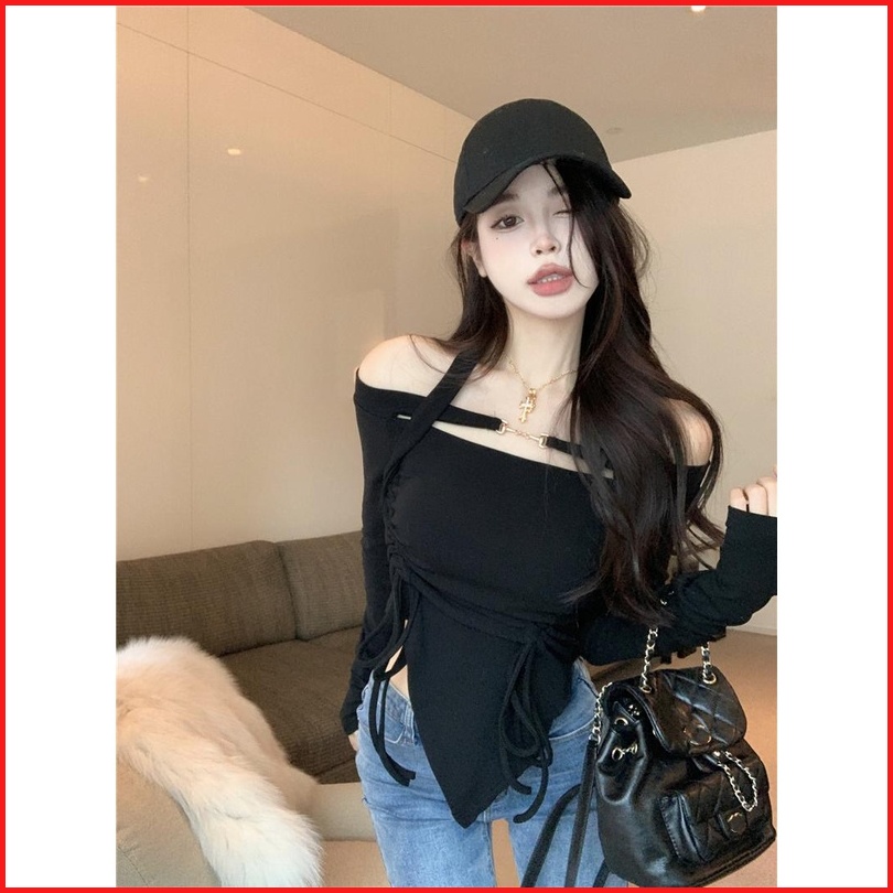 Cohan Ds011 Women S Croptop Slimbody Square Neck Long Sleeve Hitam Putih S M L