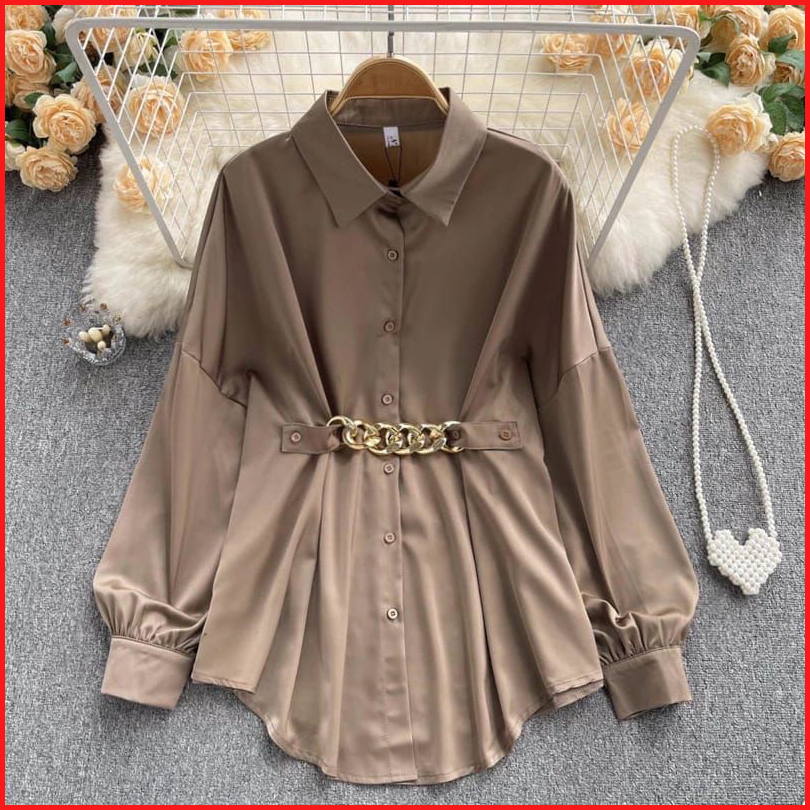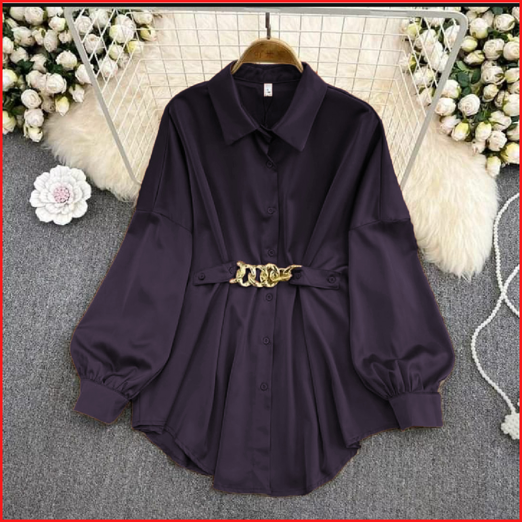 Kemeja Wanita Polos Motif Rantai Lengan Balon Blouse Atasan Full Kancing Korean Style Oversize Jumbo
