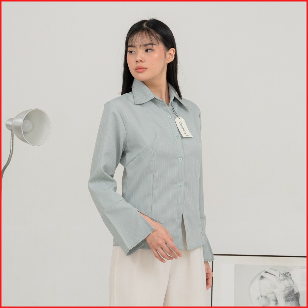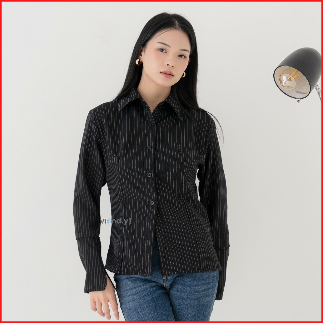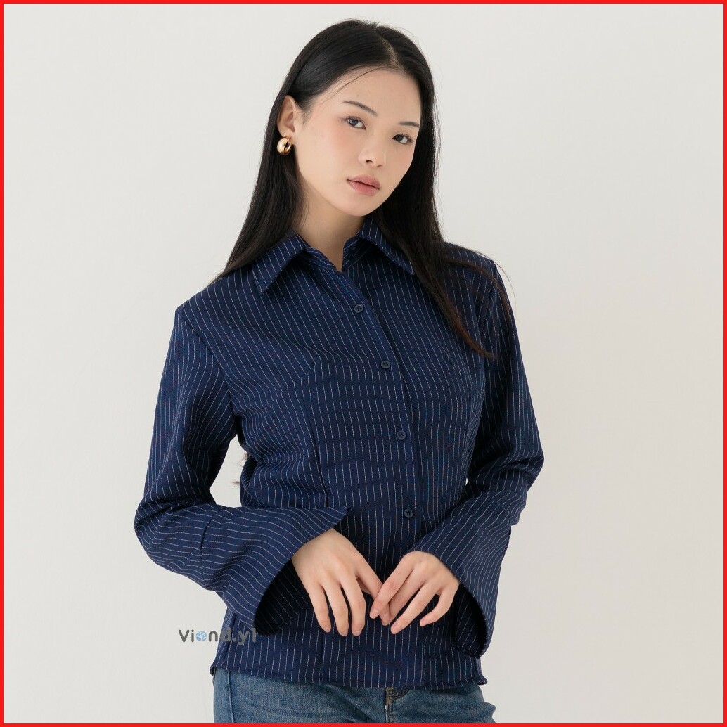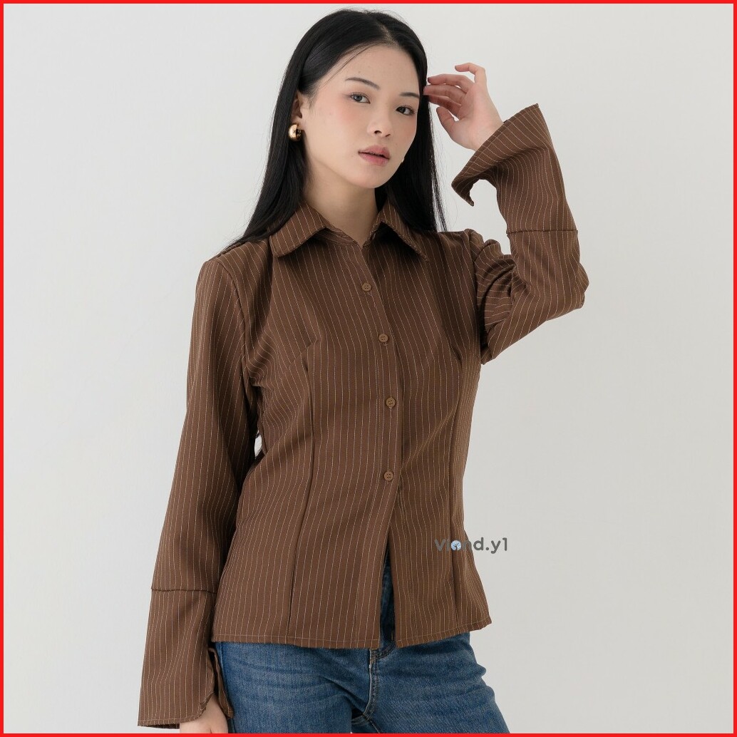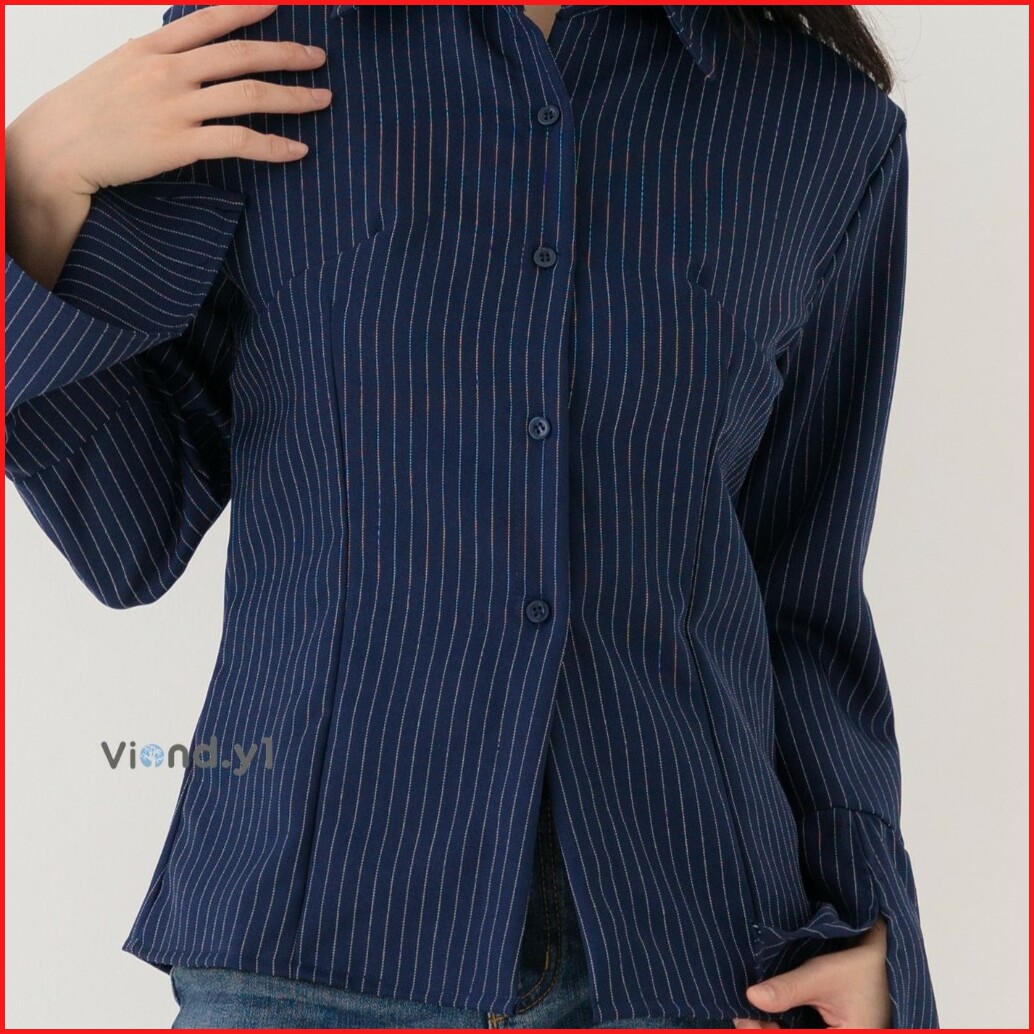 Blouse Fitted Salur Kemeja Wanita Longsleeve Atasan Stripe Cewek Korea Slim Fit E.213