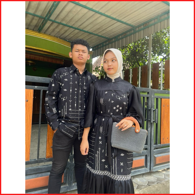 Shanum Hitam Gamis Couple Set Hijab Batik Kombinasi Polos Santorini Silk Premium Lebaran Kondangan Sarimbit