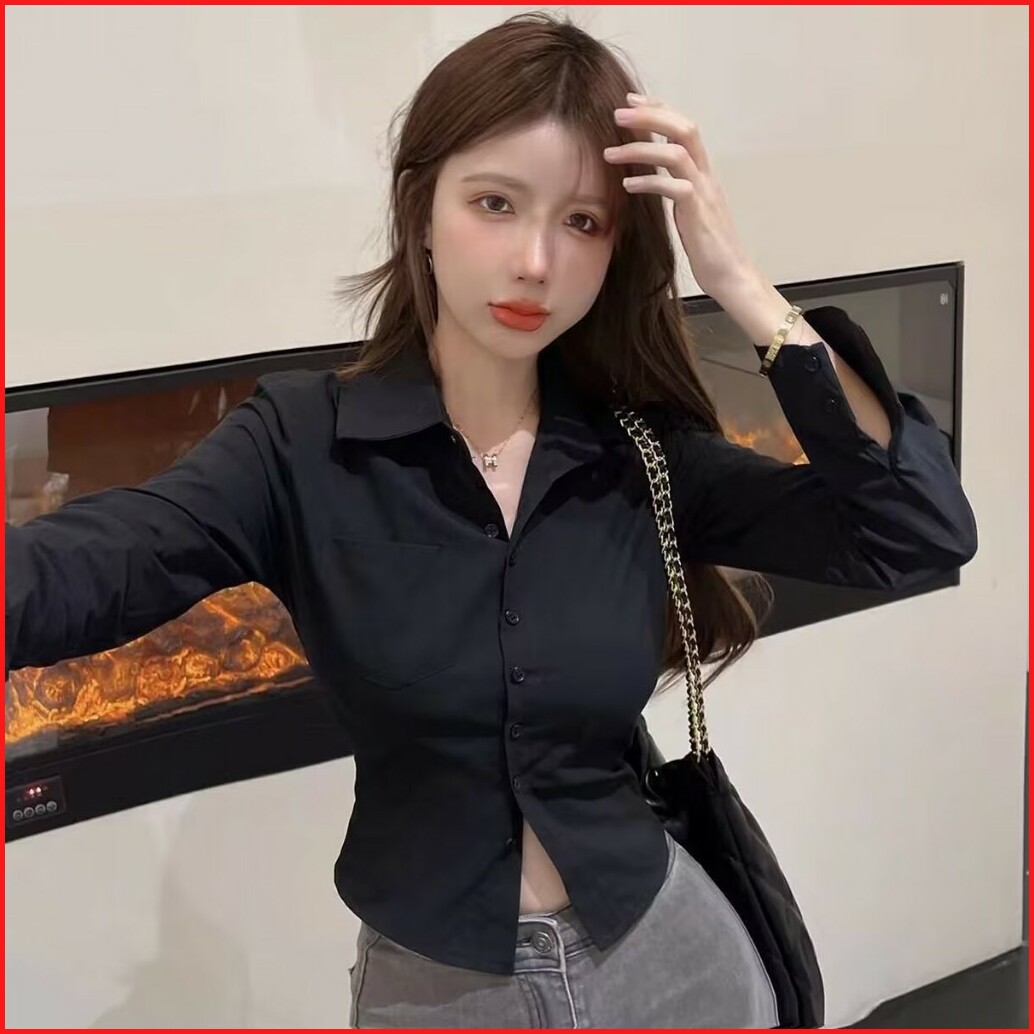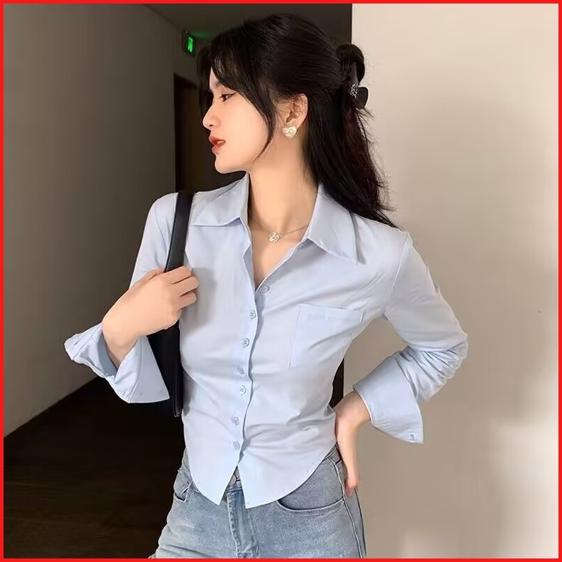 Kemeja Wanita Lengan Panjang Gaya Korea Kemeja Kasual Warna Polos Kemeja Wanita Lengan Panjang Biru