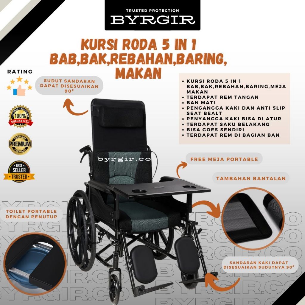 BYRGIR Kursi Roda Lipat Wheelchair 5in1 Multi fungsi BAB Toilet Meja Makan Travel Travelling Lansia Selonjor Rebahan Bar