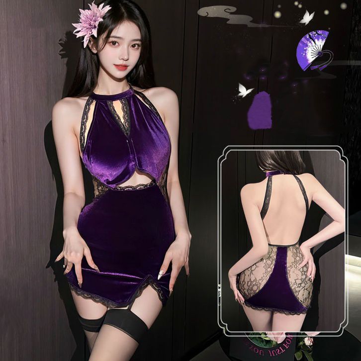 TERLAKU Baju Tidur Renda Seksi Panas Menyambung Beludru Halter Lingerie Cheongsam Backless Sexy Hot Menggoda