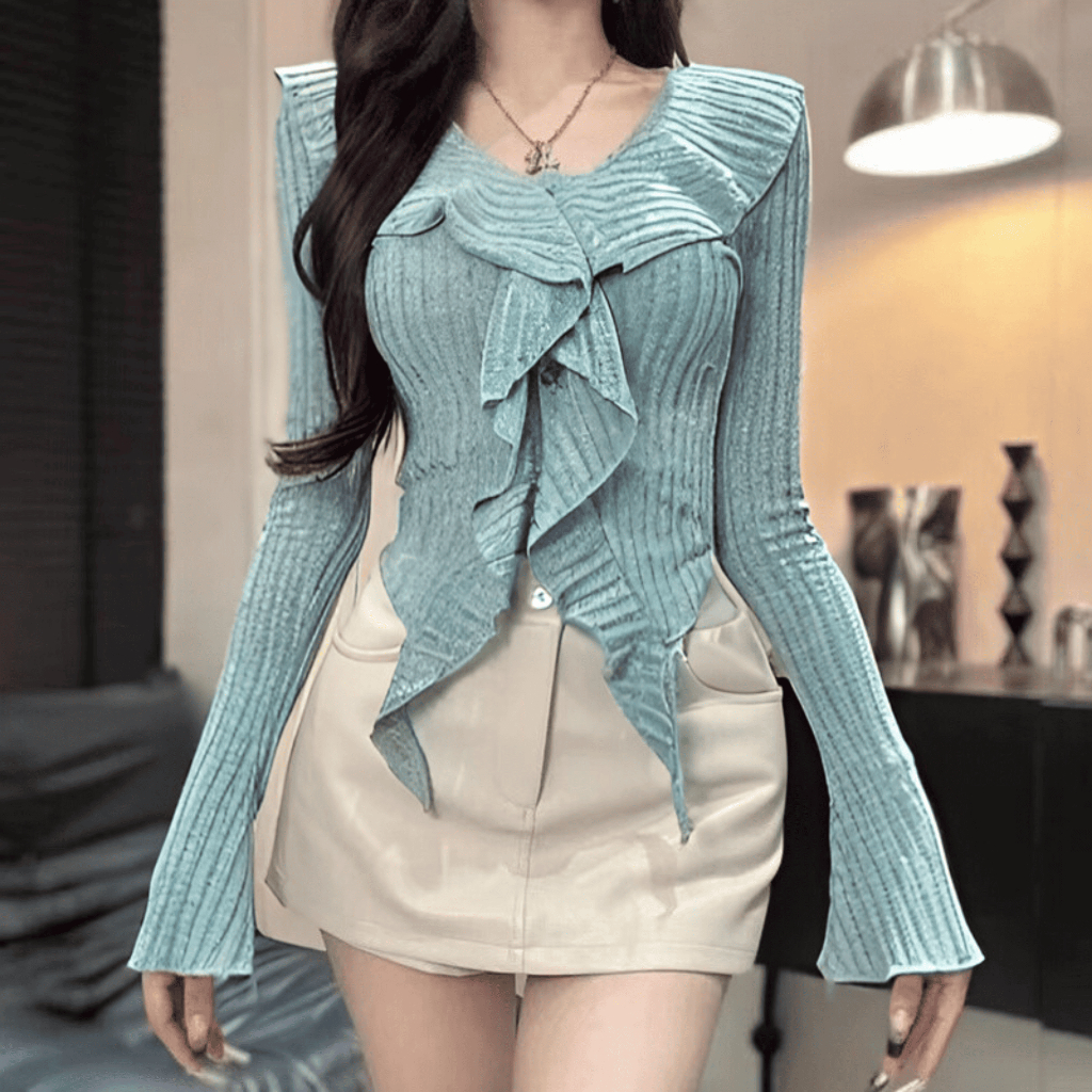 AJW Atasan Wanita Ruffle Knitwear Lengan Panjang RQM | Atasan Rajut Wanita Ruffle Kerah Kekinian Premium | Baju Wanita R