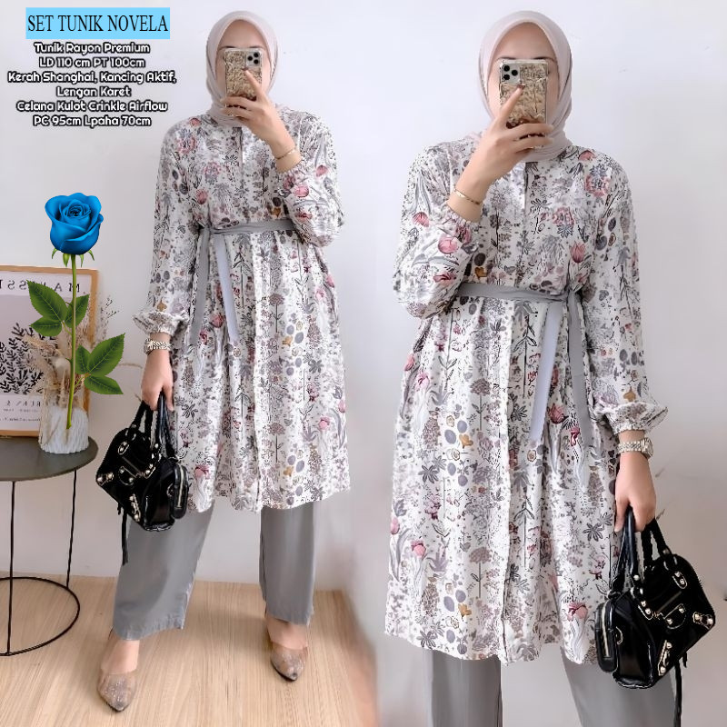 Novela Set Tunik One Set Wanita Busui Kekinian Rayon Premium Baju Setelan Celana Kulot LD 110 cm