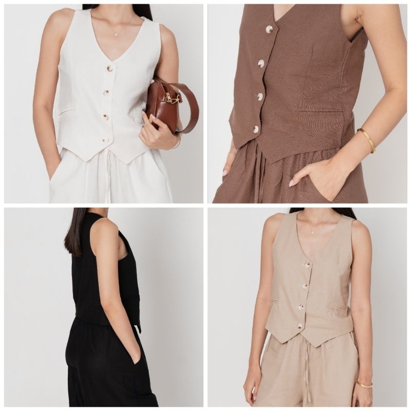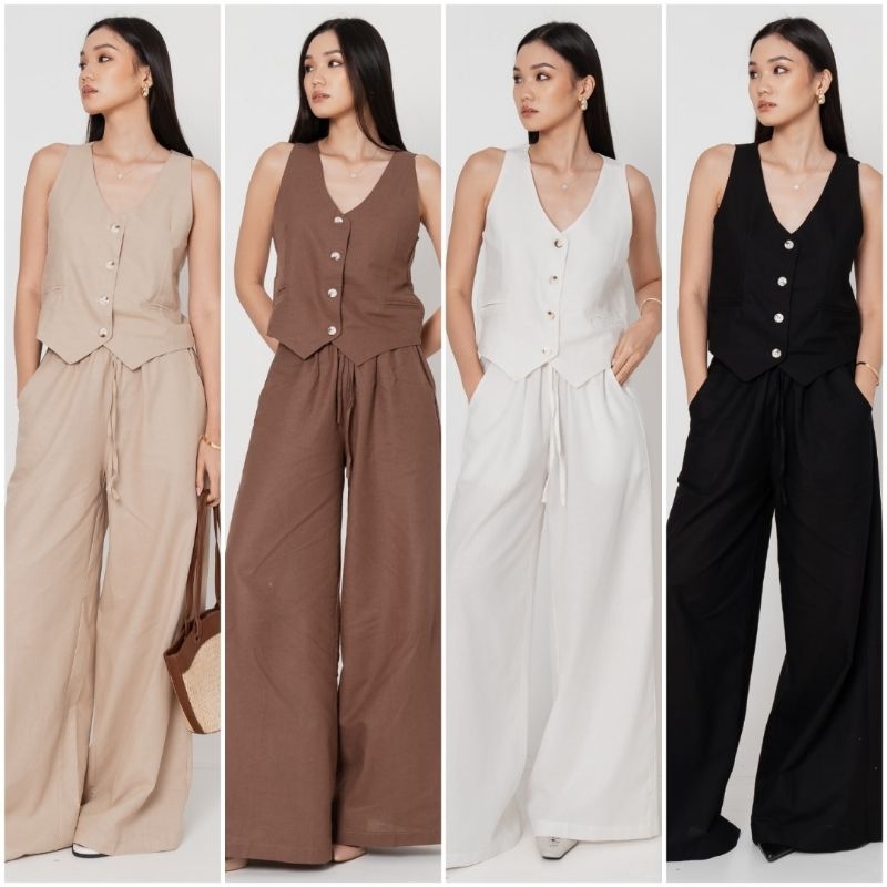 SERAPHINE 2 IN 1 LINEN SET | BUTTON VEST WITH LONG CULLOTE PANTS / SETELAN OUTER ROMPI & CELANA GOMBRONG | SHELICIOUSROO