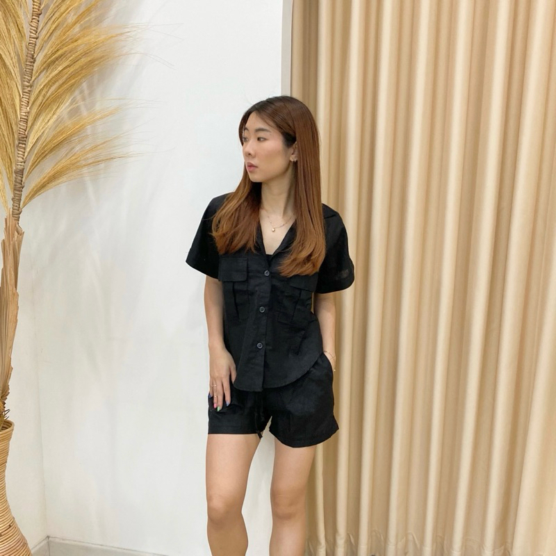 AVE 04 - Setelan Hotpant Kemeja Linen Pocket | Oneset Kemeja Celana Pendek