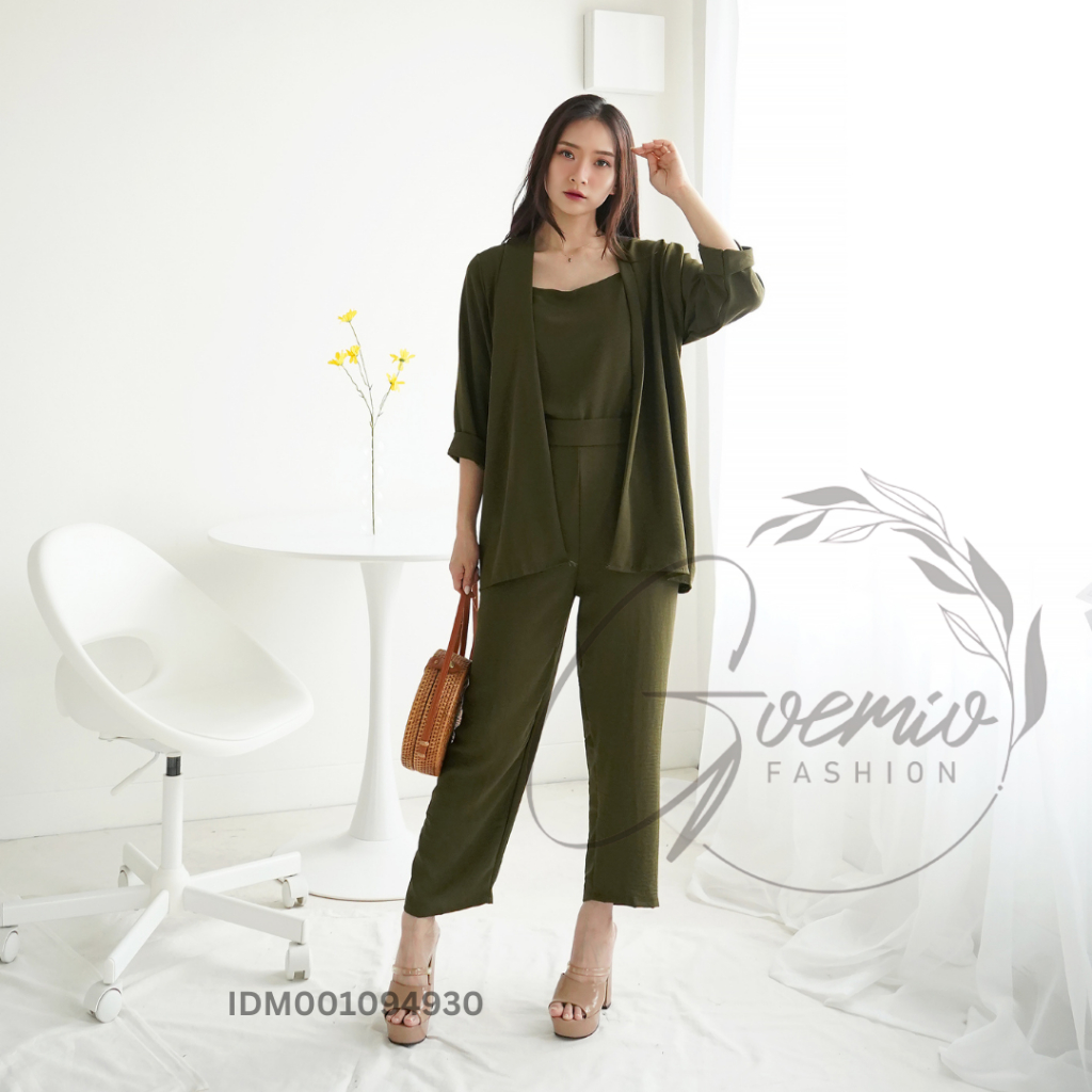 Hana 3 in 1 Set Blazer Lengan 3/4 Celana Panjang Crinkle setelan formal Wanita Atasan Simple Linen Casual Baju