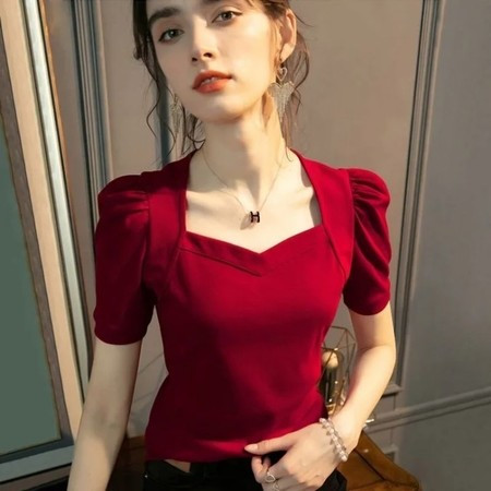 KARIZKA - Atasan Wanita Kekinian Tops T Shirts Lady Slim Short Puff Sleeve Square Collar Blouse Tops