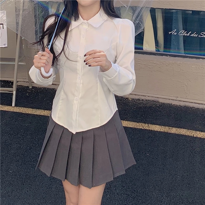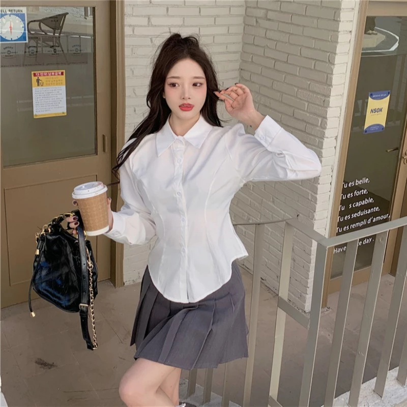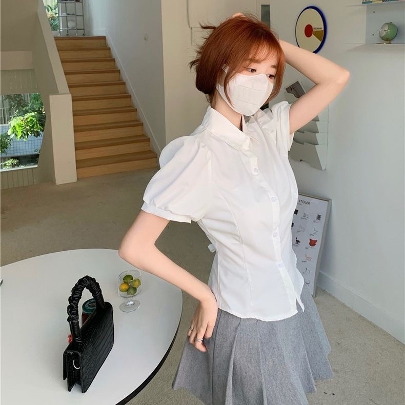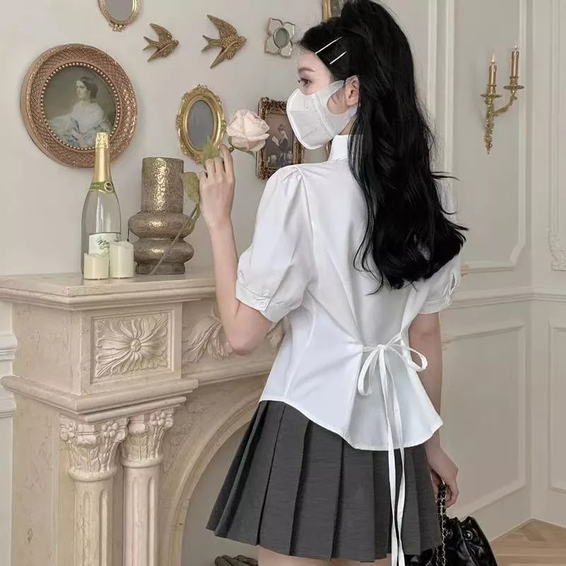 Kemeja Lengan Puff Atasan Kemeja Lengan Panjang Pinggang Tali Putih Kasual Gaya Korea Wanita