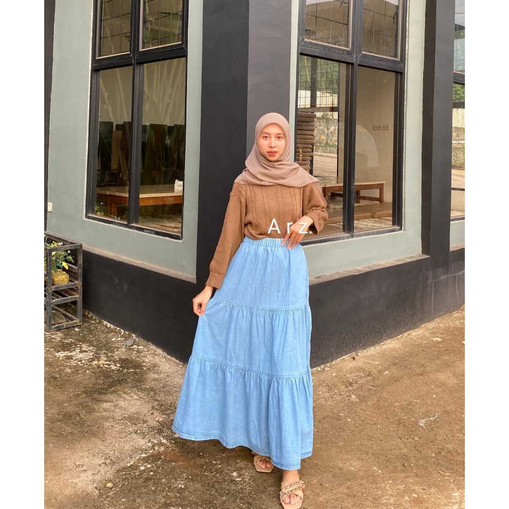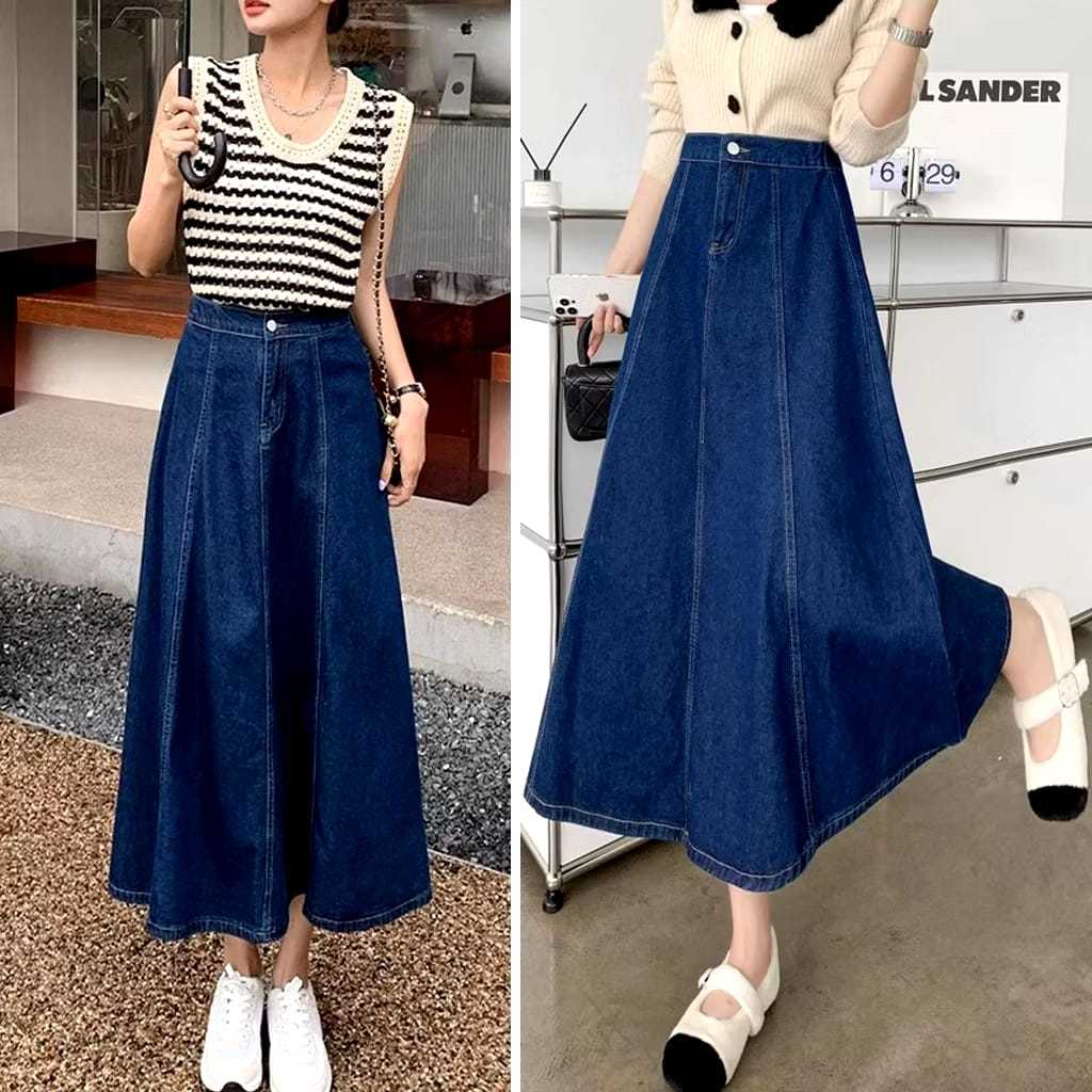 Ruffle A-Line Rok Jeans Skirt Wanita Panjang Tebal Nyaman