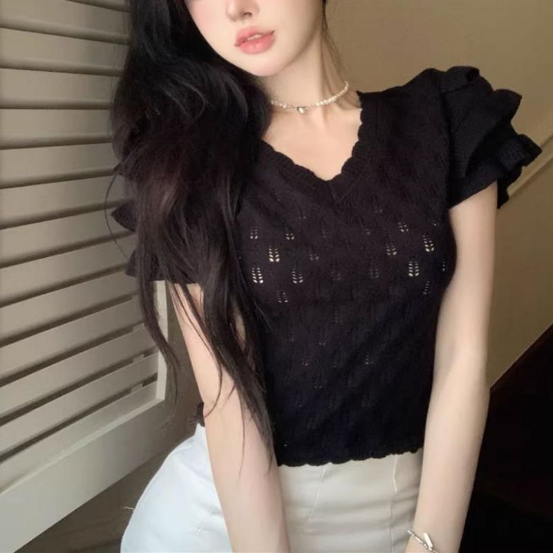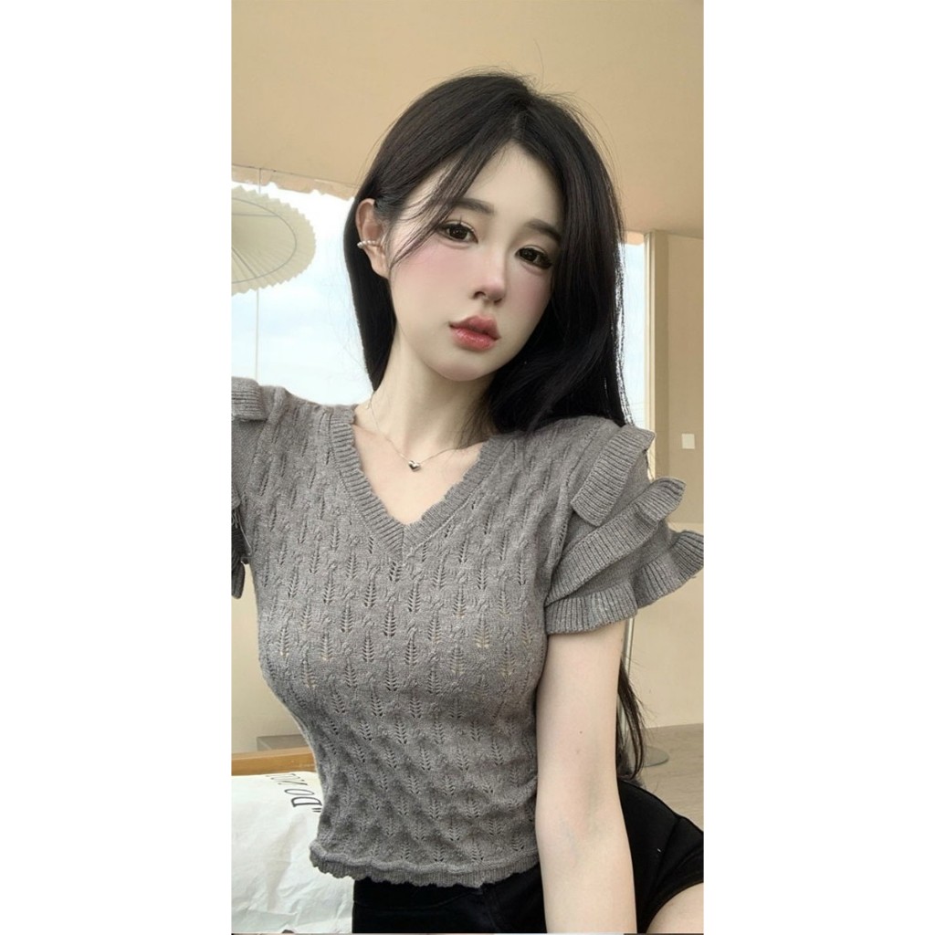 Atasan Wanita Korea Style Lengan Double Ruffle Vneck Knit Terbaru | Baju Wanita Crop Top Jaring Jaring Halus Terbaru | A