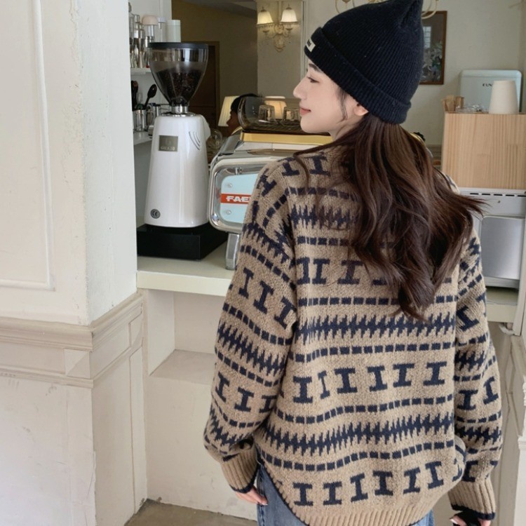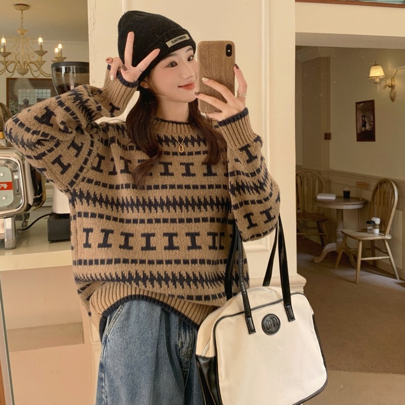 [Star]Sweater Pullover Leher Bulat Jacquard Longgar Yang Chic Untuk Wanita