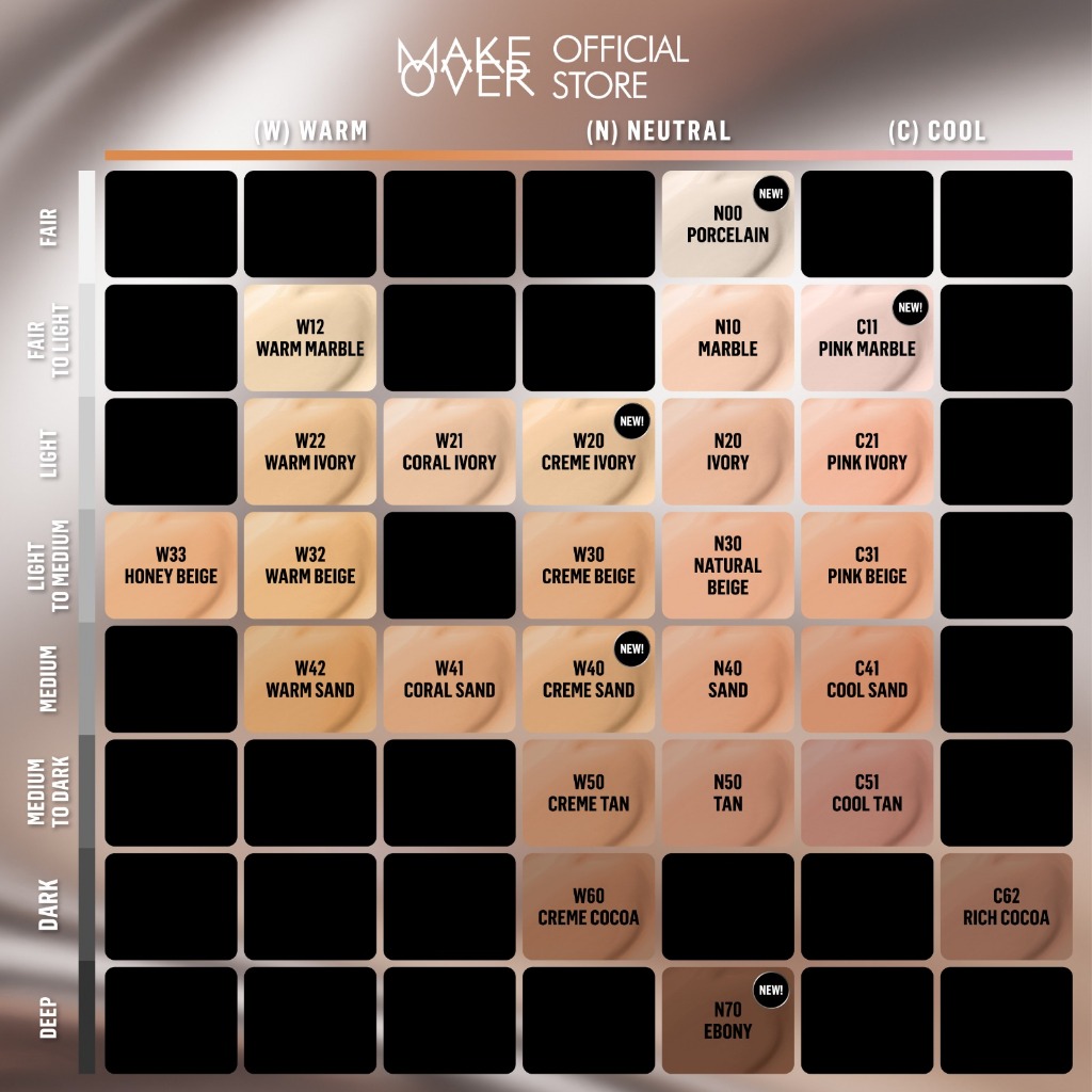 N10 Marble , W22 Warm Ivory , C21 Pink Ivory, N30 Natural Beige , W42 Warm Sand , W41 Coral Sand, W33 Honey Beige , C62 Rich Cocoa , N50 Tan, W30 Creme Beige , N20 Ivory , N40 Sand, W12 Warm Marble , C51 Cool Tan , C41 Cool Sand, W32 Warm Beige , C31 Pink Beige , W21 Coral Ivory, W50 Creme Tan , W60 Creme Cocoa, NEW! N00 Porcelain , NEW! C11 Pink marble, NEW! W20 Creme Ivory , NEW! W40 Creme Sand, NEW! N70 Ebony