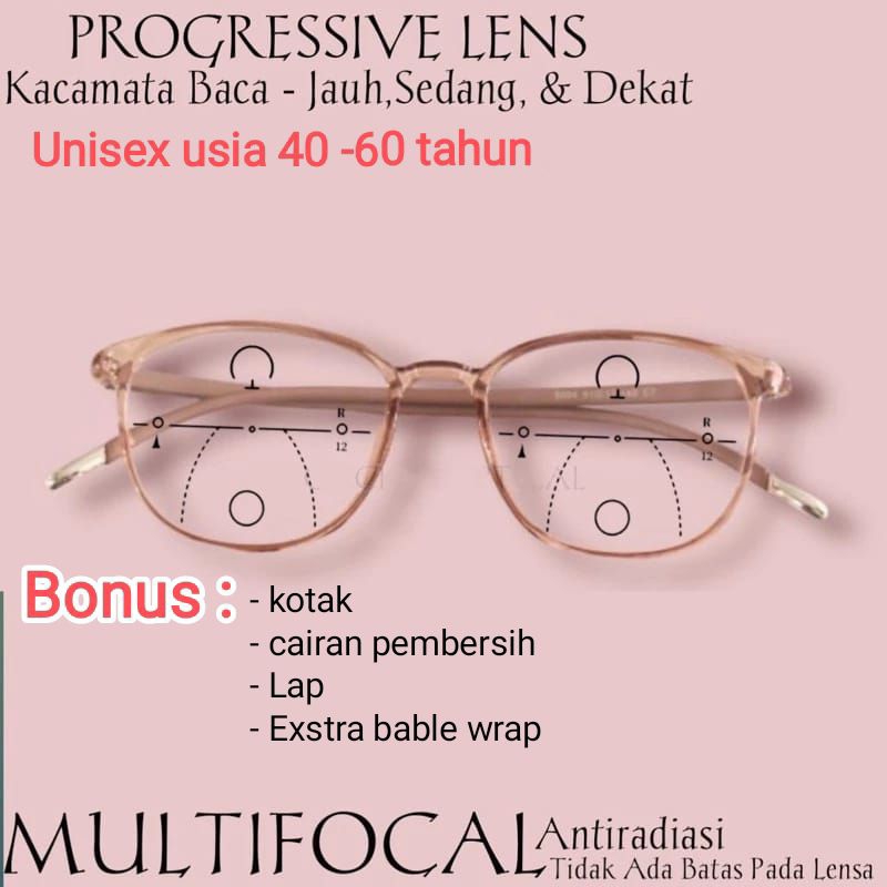 Kacamata plus progresif(baca dan jalan) laki-laki dan perempuan usia 40 sd 60 tahun ukuran +1.00-+300 bahan ringan dan lentur