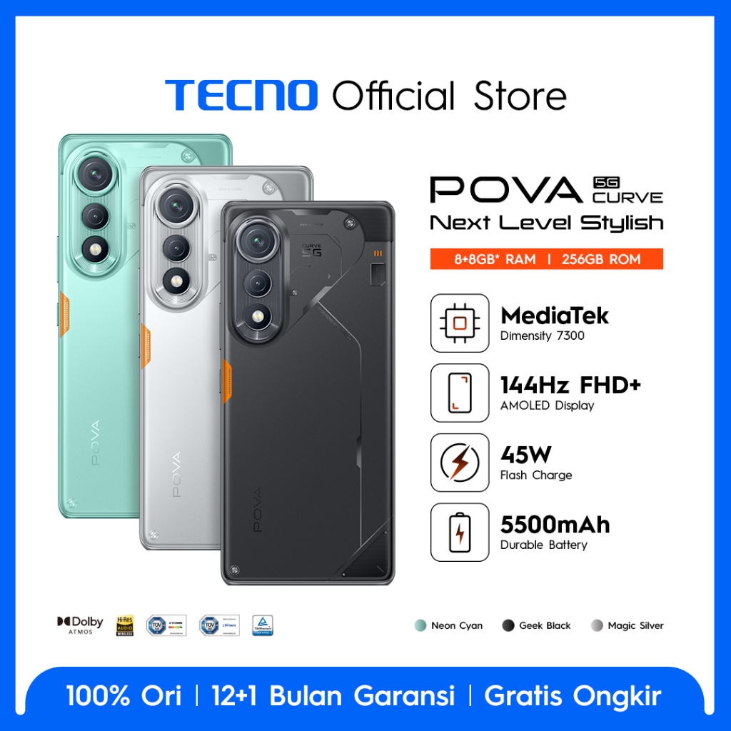 [Mall] TECNO OFFICIAL STORE TECNO POVA CURVE 5G 8+8GB*/256GB 5500MMAH + BYPASS CHARGING 2.0 D7300 6,78 CAMON 40 PRO 5G