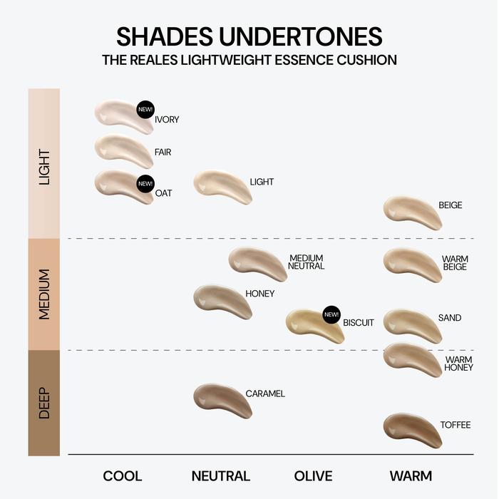 Beige, Biscuit, Caramel, Fair, Honey, Ivory, Light, Medium Neutral, Oat, Sand, Toffee, Warm Beige, Warm Honey