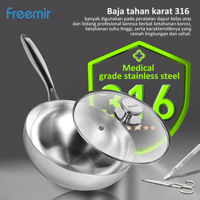 Promo Steamer AF freemir Wajan Stainless Steel 316 Wok Pan Medical Grade 20 & 24 Cm Zero Coating