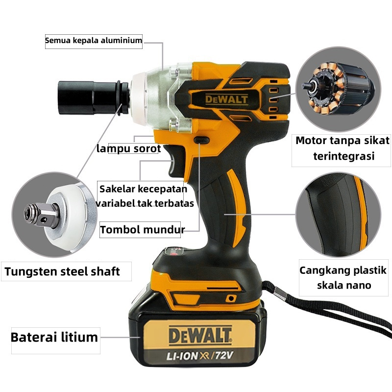 DEWALT 1300NM/72V Kunci Impact Wrench Tanpa Kabel Cordless Bor Impact Serbaguna dengan Baterai untuk Baut Mobil