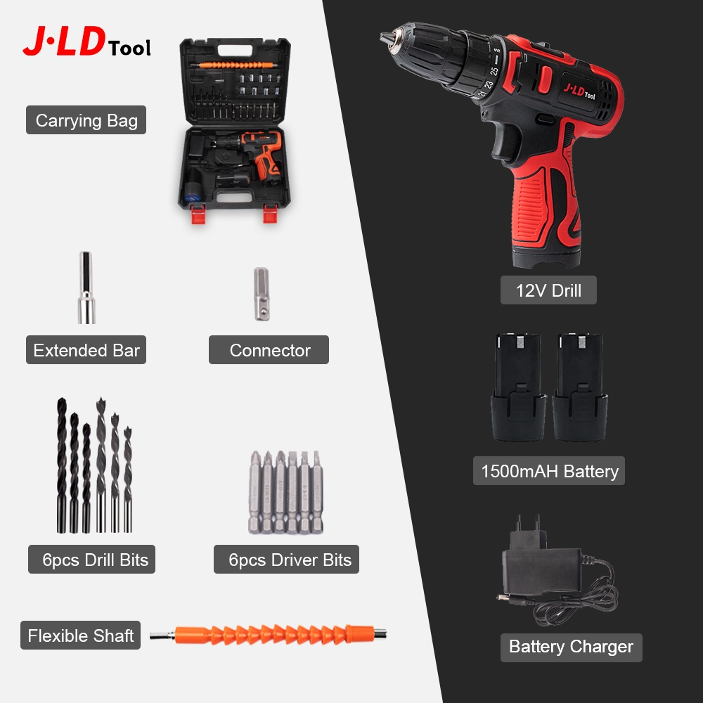 JLD Mesin bor cas 12V Mesin bor baterai tangan 10mm Cordless Drill 2 baterai Bor tangan tanpa kabel Untuk bor kayu/beton dan buka baut