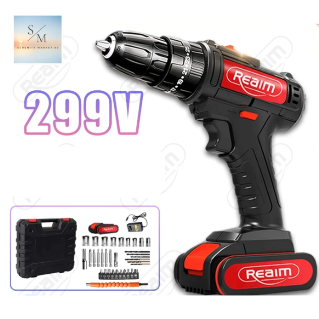 Reaim Mesin Bor 2 IN 1 299V Baterai Bor Bor Impact listrik Cordless 2 Mode Kecepatan Electric Drill Bor Cordless