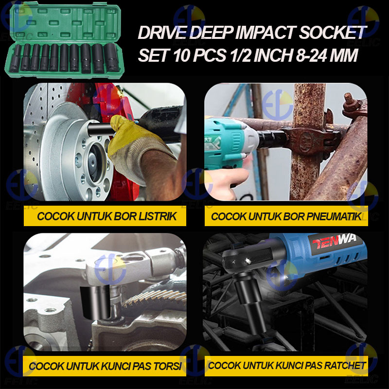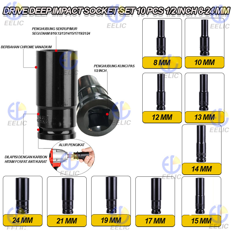 EELIC Dis-8S24MM Drive Deep Impact Socket Set Isi 10 Pcs 1/2 Inch Dari Ukuran 8-24MM