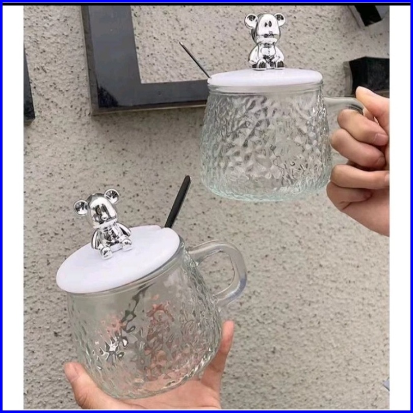 Gelas Kaca Mug Tutup Beruang 350ml Dengan Sendok