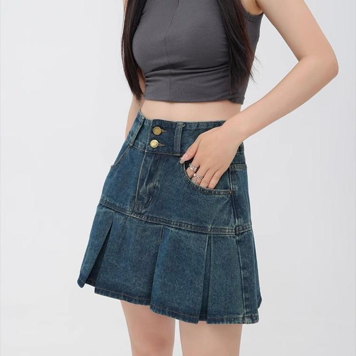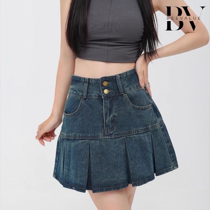 Rok Wanita/Baju Kemeja Wanita Beevalue Rok Mini Highwaist Wanita Denim A line Pleated Skirt Ada
