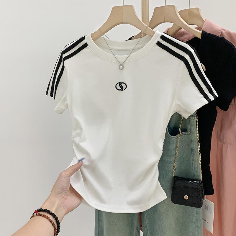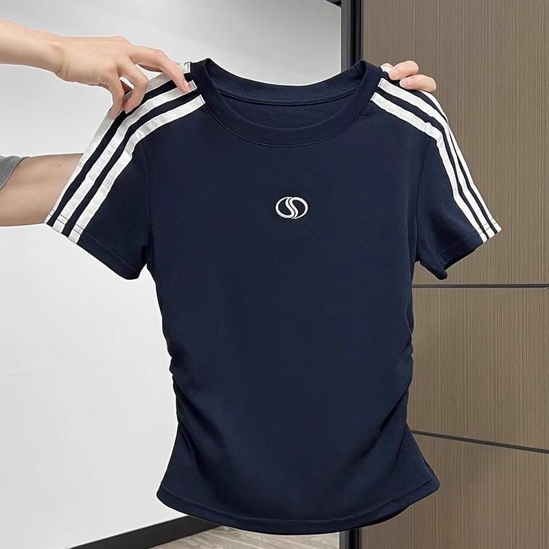 T-Shirt Lengan Pendek Bordir Bergaris Wanita Crop Top Ramping Lipit Biru Laut