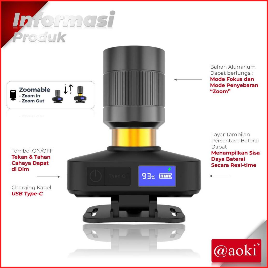 Aoki Senter Kepala Zoom Smartbright Stepless Dimming Usb-c Layar Persentase Baterai Outdoor Ideal