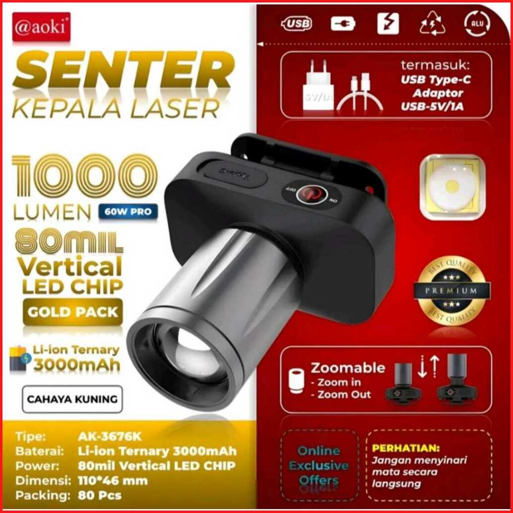Senter Kepala Zoom Aoki Ak-3685a Super Terang Head Lamp Led 60 Watt Super Terang Senter Kepala Rechargeable Type C