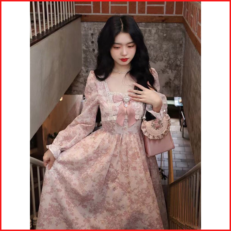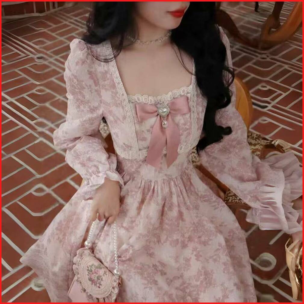 First Girl - Dress Maxi Merah Muda Motif Bunga Pita Gaun Pinggang Tinggi Wanita Lengan Panjang Prancis- G056