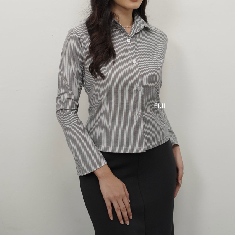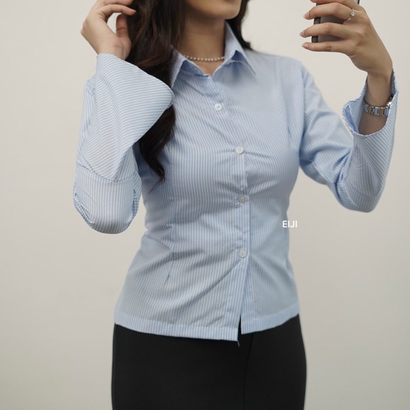 Kemeja Kantor Salur Kerja Wanita Polos Gingham Katun Lengan Panjang Formal Fitted Slim Fit Lengan Panjang
