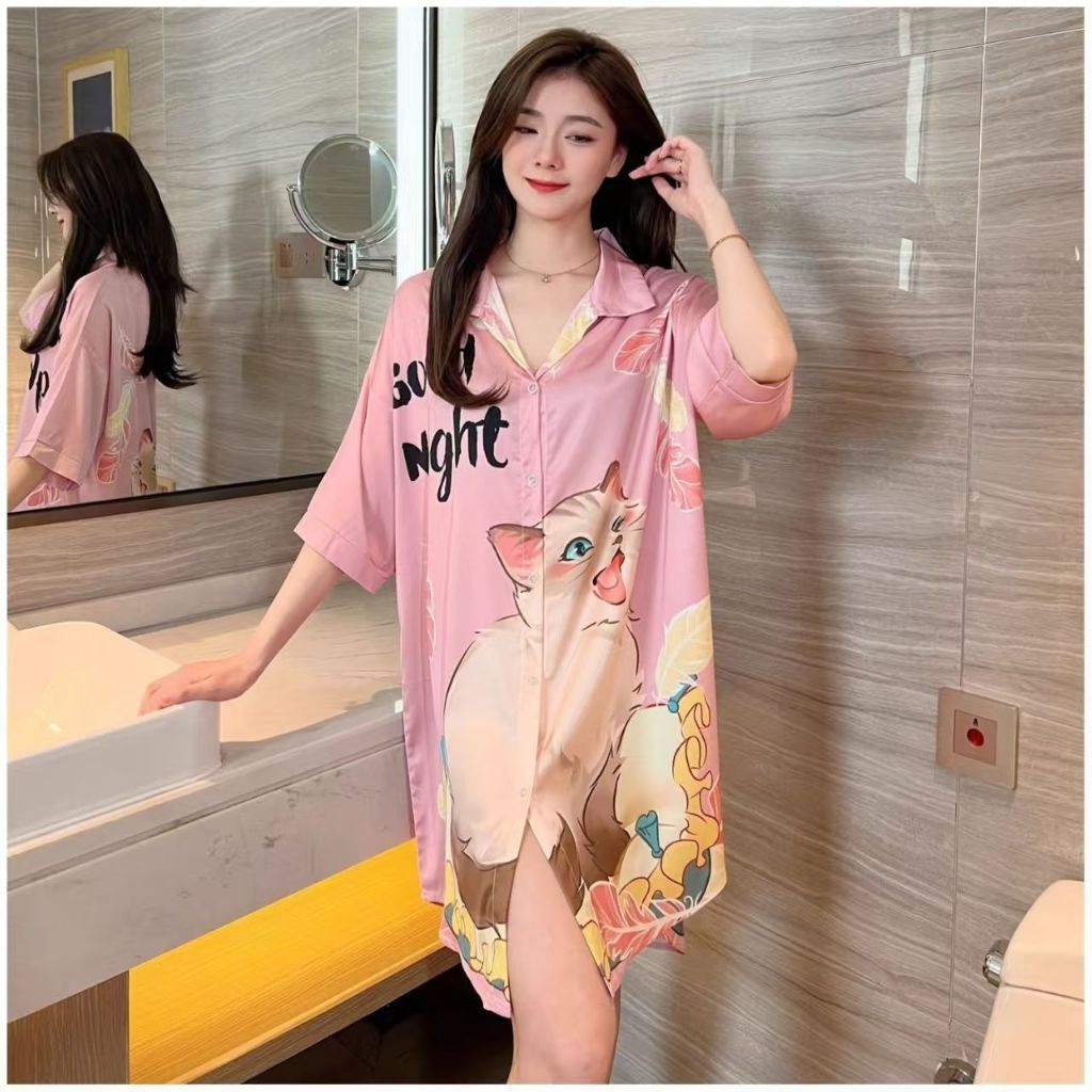 Gaun kemeja piyama sutra es pola kucing lucu wanita/dress tidur korea wanita jumbo sexy