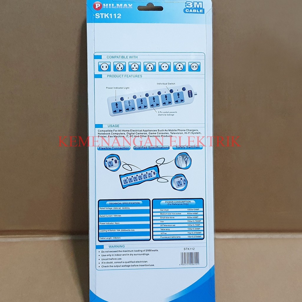 PHILMAX STOP KONTAK 6 LUBANG / COLOKAN KABEL 6 SOCKET + SWITCH / SAKLAR KABEL 3M STOPKONTAK 3 METER / COLOKAN LAMPU MASI
