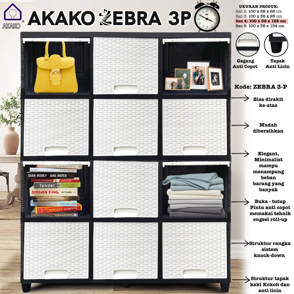 Lemari Plastik Serbaguna AKAKO ZEBRA 3 PINTU PUTIH ROTAN Laci 6 Pintu Rak TV Tempat Penyimpanan Baju