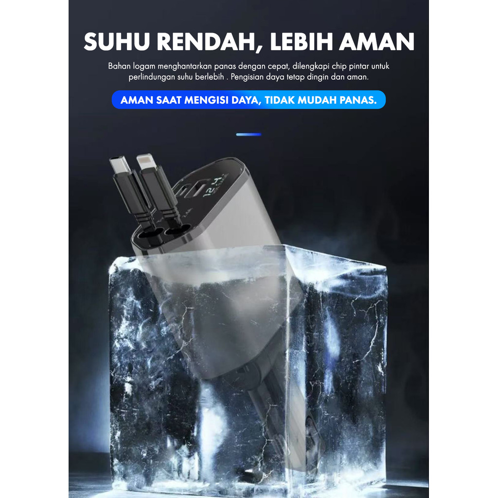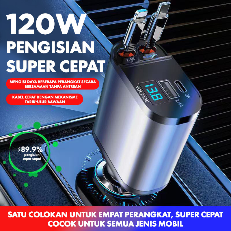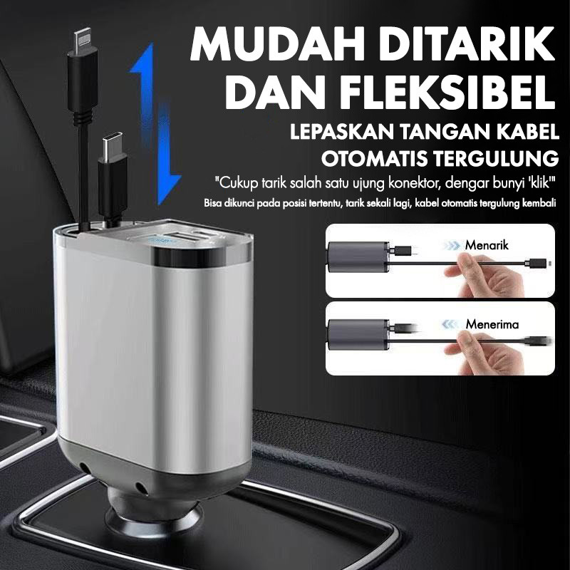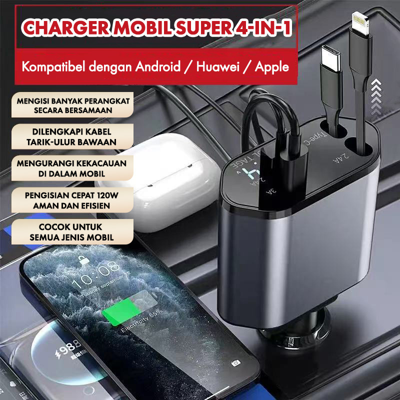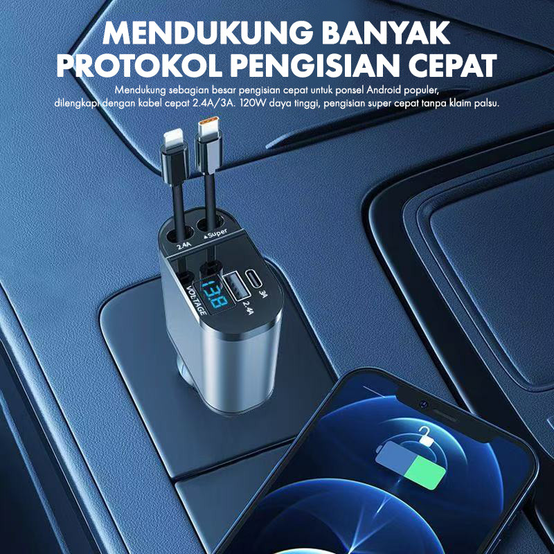 Smarteck Retractable Cable Car Charger SCH02 Colokan Mobil 4 Ports USB IOS Type C Lightning 4in1 Pengisian Cepat 120W Fast Charging Rectractable Cable