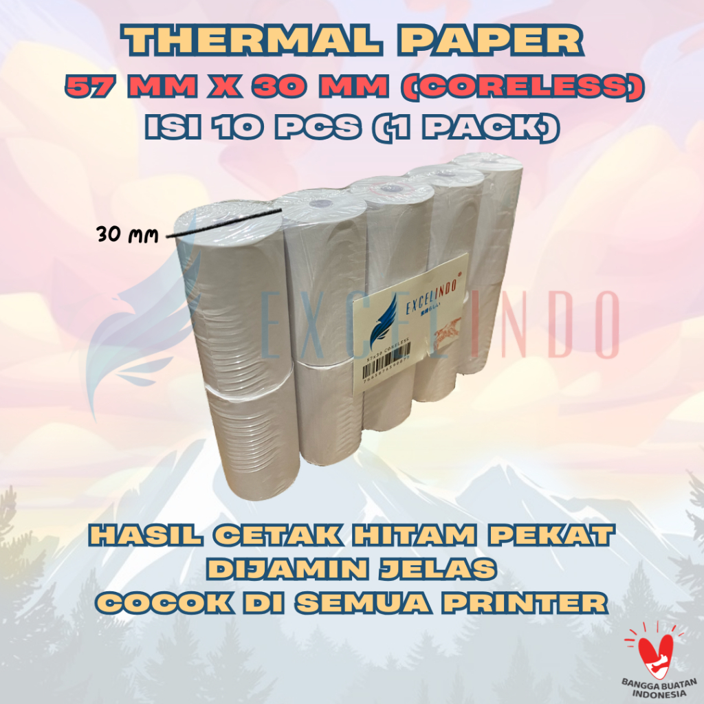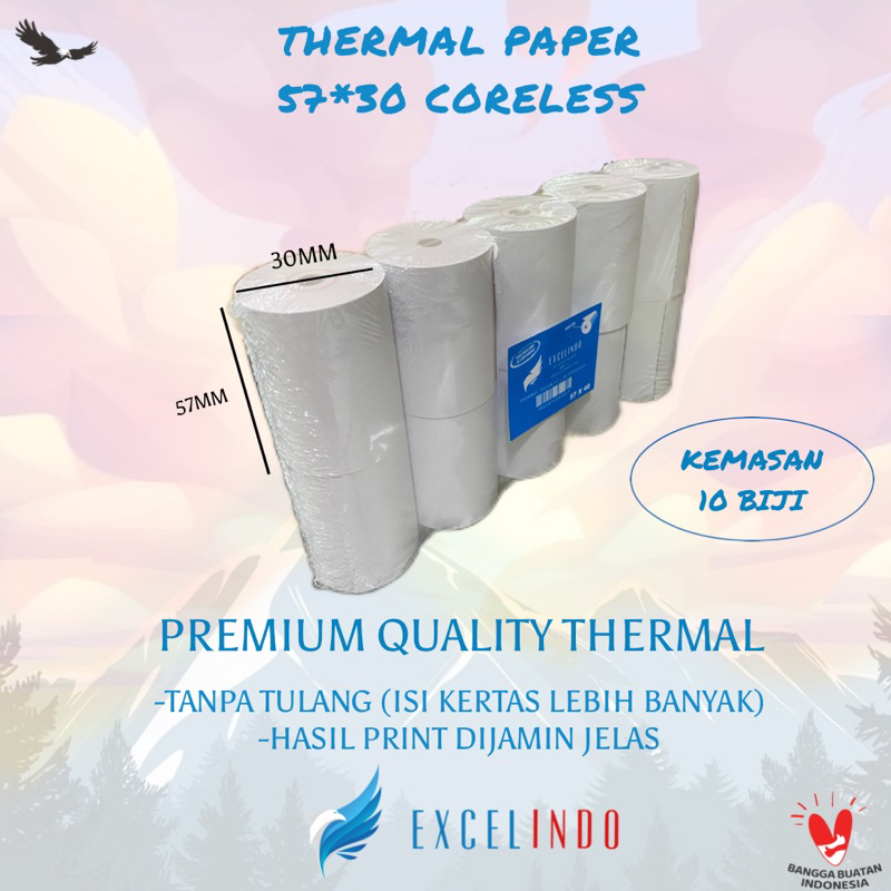 (10 BIJI) GROSIR EXCELINDO Kertas Kasir Thermal Paper EDC 57x30 CORELESS TANPA TULANG FULL KERTAS